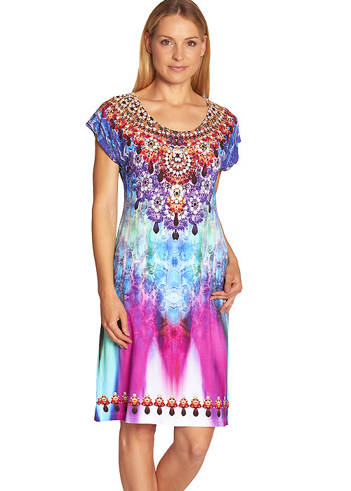 The matching sundress to Feraud's Diamonds swimsuit, bikini and pareo is the fourth in a very exciting range. This new collection of swimwear from Paris' premier fashion beachwear houses. This sun dress is one of the most exquisitely designed and intricate items of beach fashion out there. The body's detailed peacock blues and glistening gold, rubies and pearls all have a kind of exotic tribal look that you might find on a Pharaoh or princess, not an item of modern swimwear. But that's a good thing, as the unconventional approach to their work makes for one of the most original items of beachwear in our collection. This sun dress has several matching items available in the same print, including a swimsuit and a bikini.
