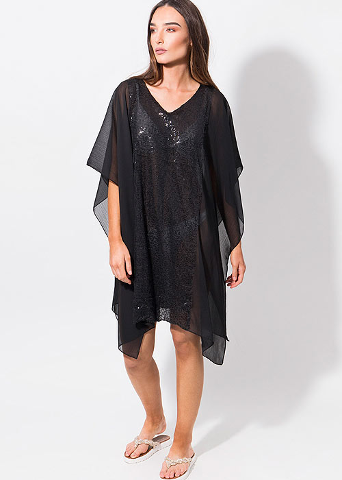 Pia Rossini is expanding beyond just accessories like bracelets and bangles. They are now making more clothing like accessories than ever before and they are beautiful. This poncho for example is light, airy, versatile and keeps the sun off you but is sheer and chic, with a gorgeous array of sequins on the front.